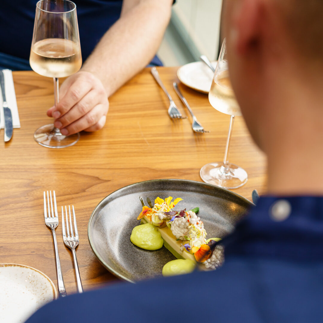 De focus van ons menu ligt op de groenten: biologisch, seizoensgebonden en vers uit eigen Hoftuin. Dagelijks komt de oogst met de bakfiets naar de keuken, waar onze chefs en chefs-to-be zich laten inspireren door wat de tuin biedt en geven hun eigen creatieve draai aan de gerechten. Vlees, vis en zuivel kiezen we bewust: verantwoord, zo lokaal mogelijk en altijd met oog voor duurzaamheid. En dit proef je.